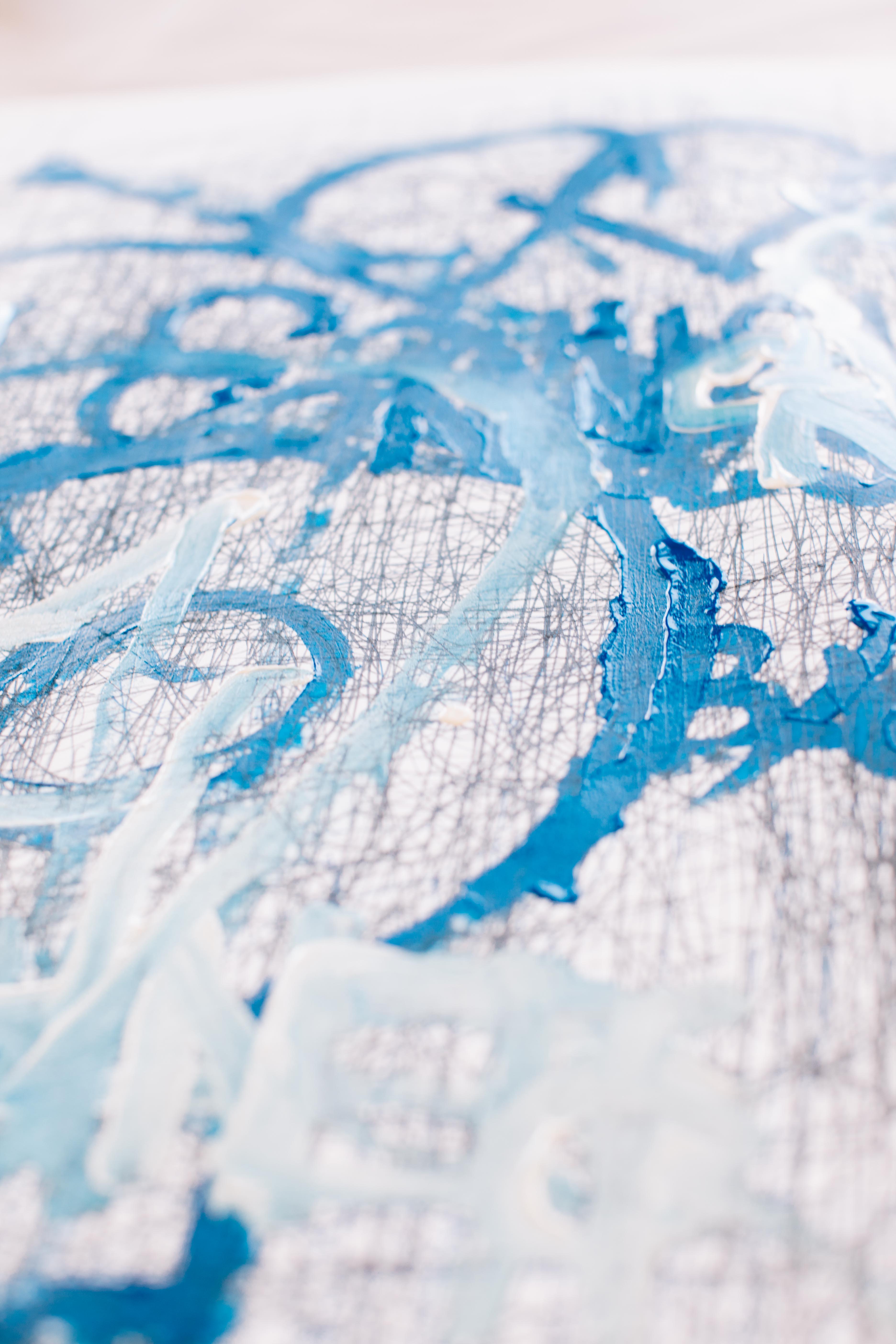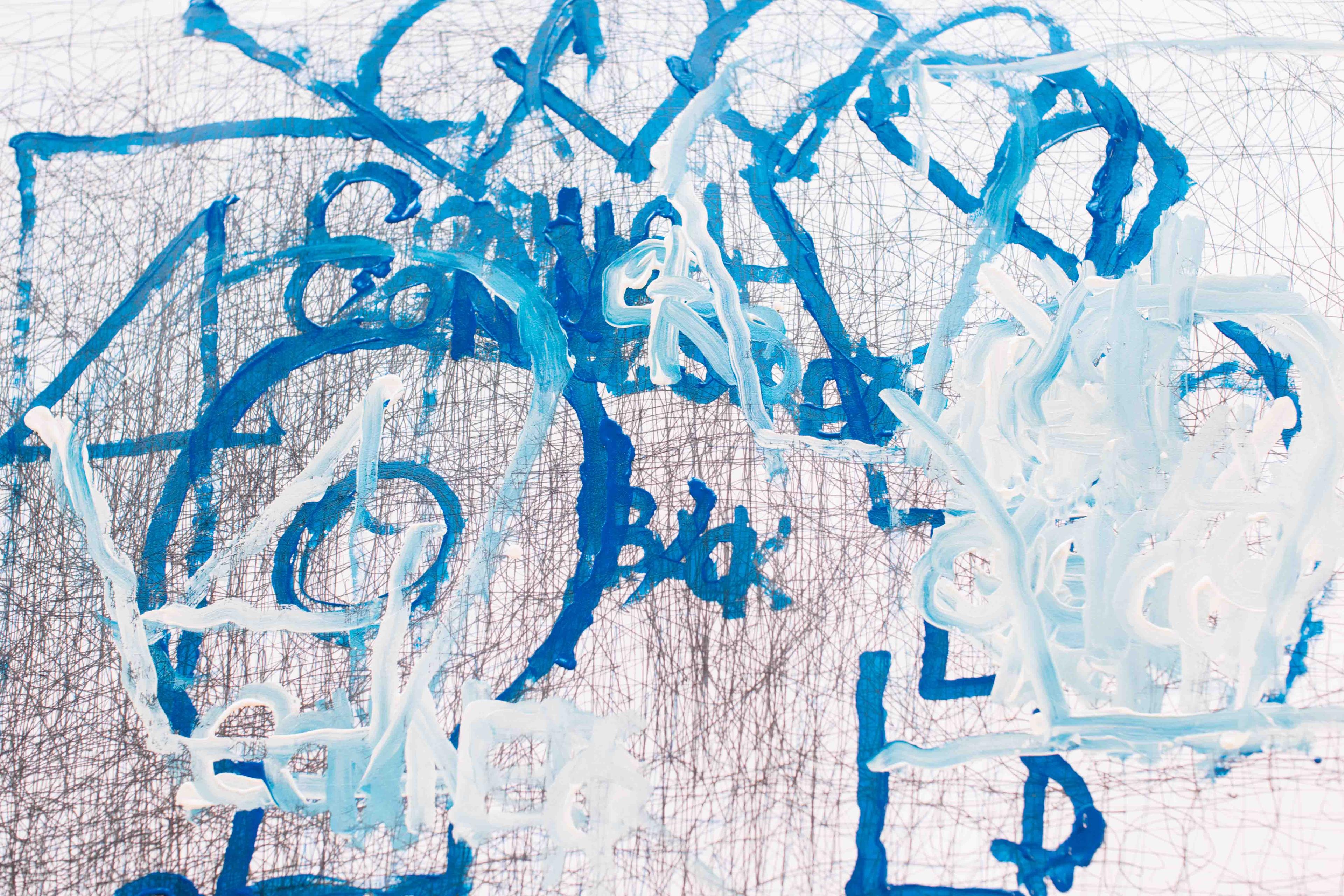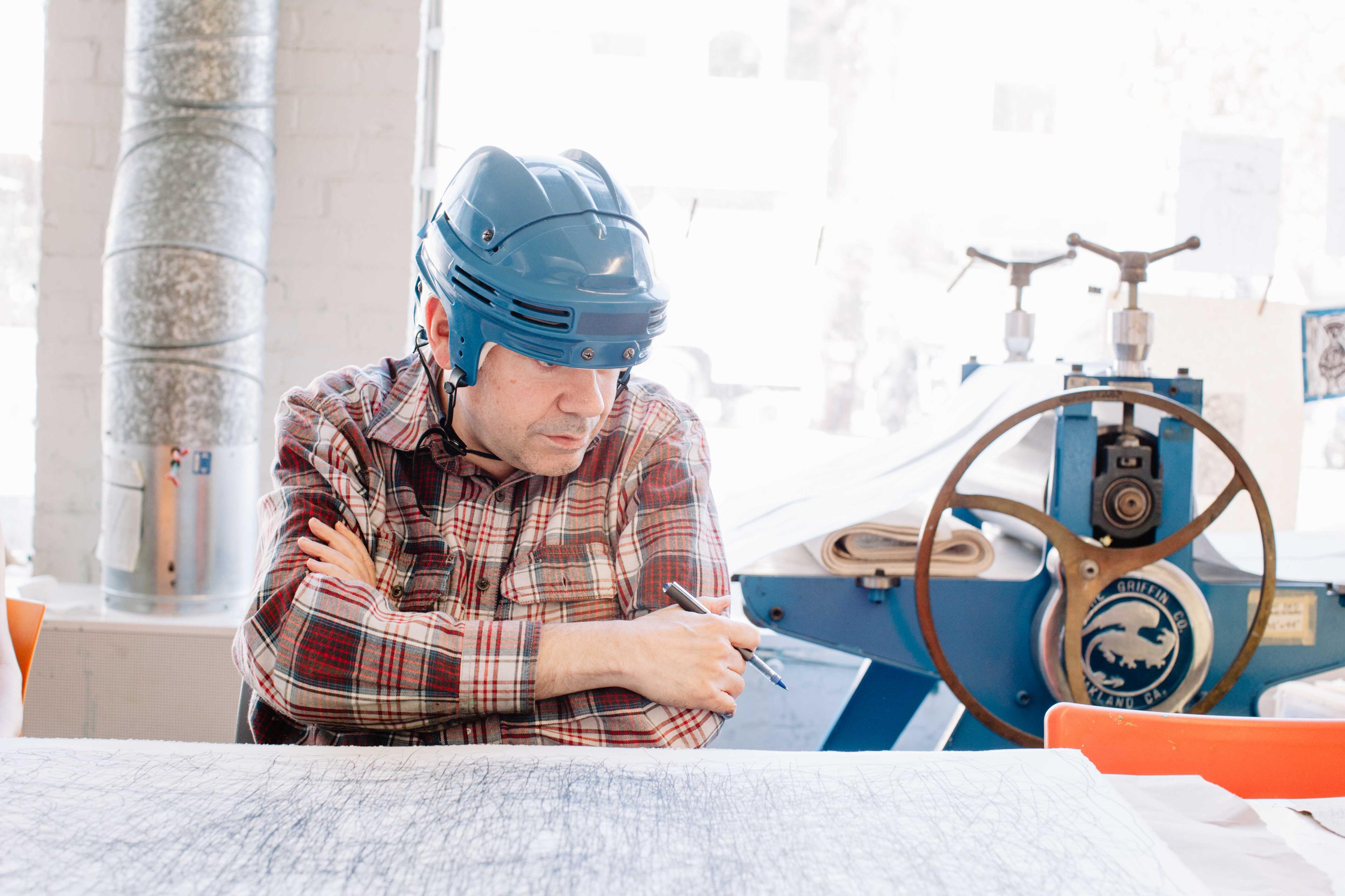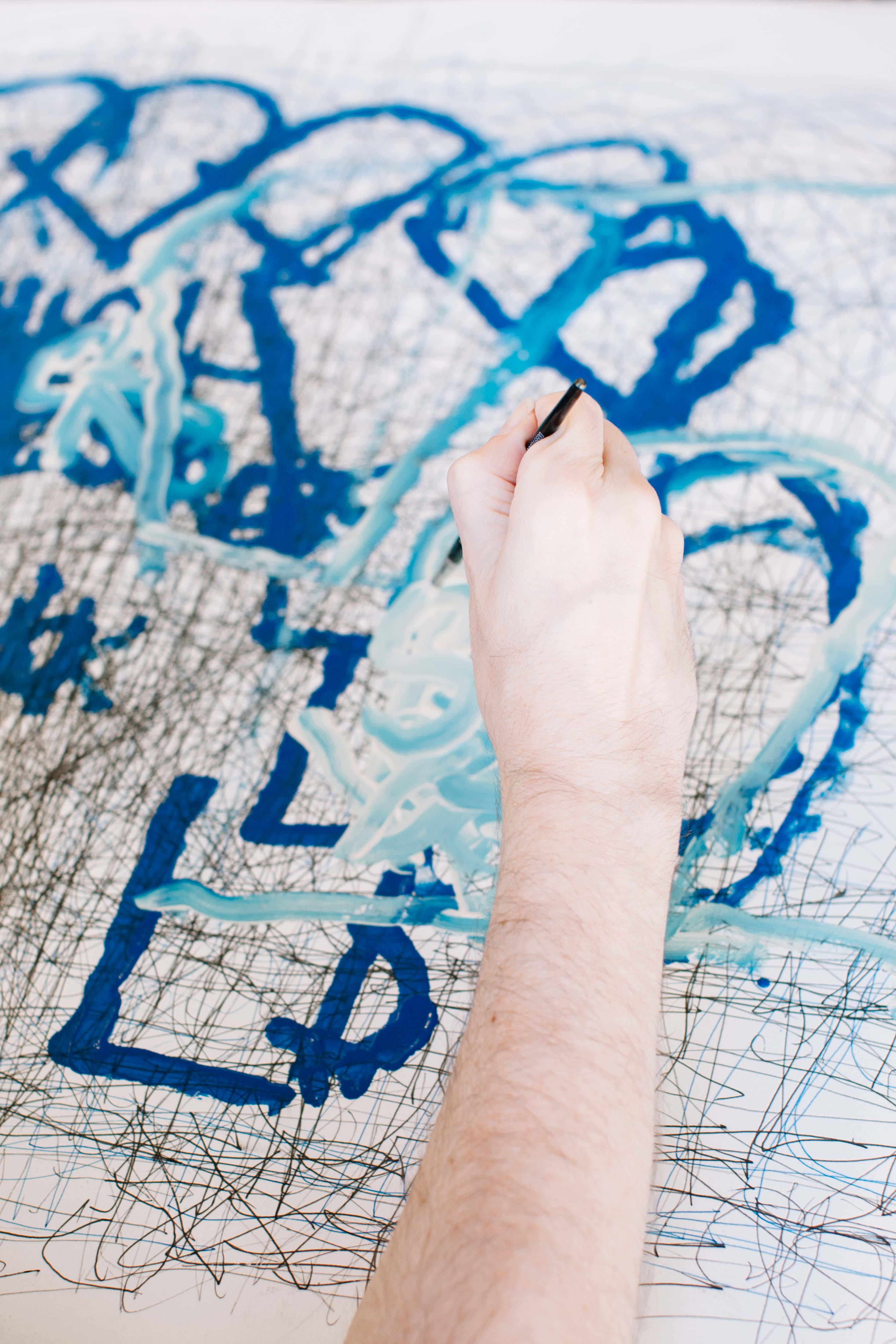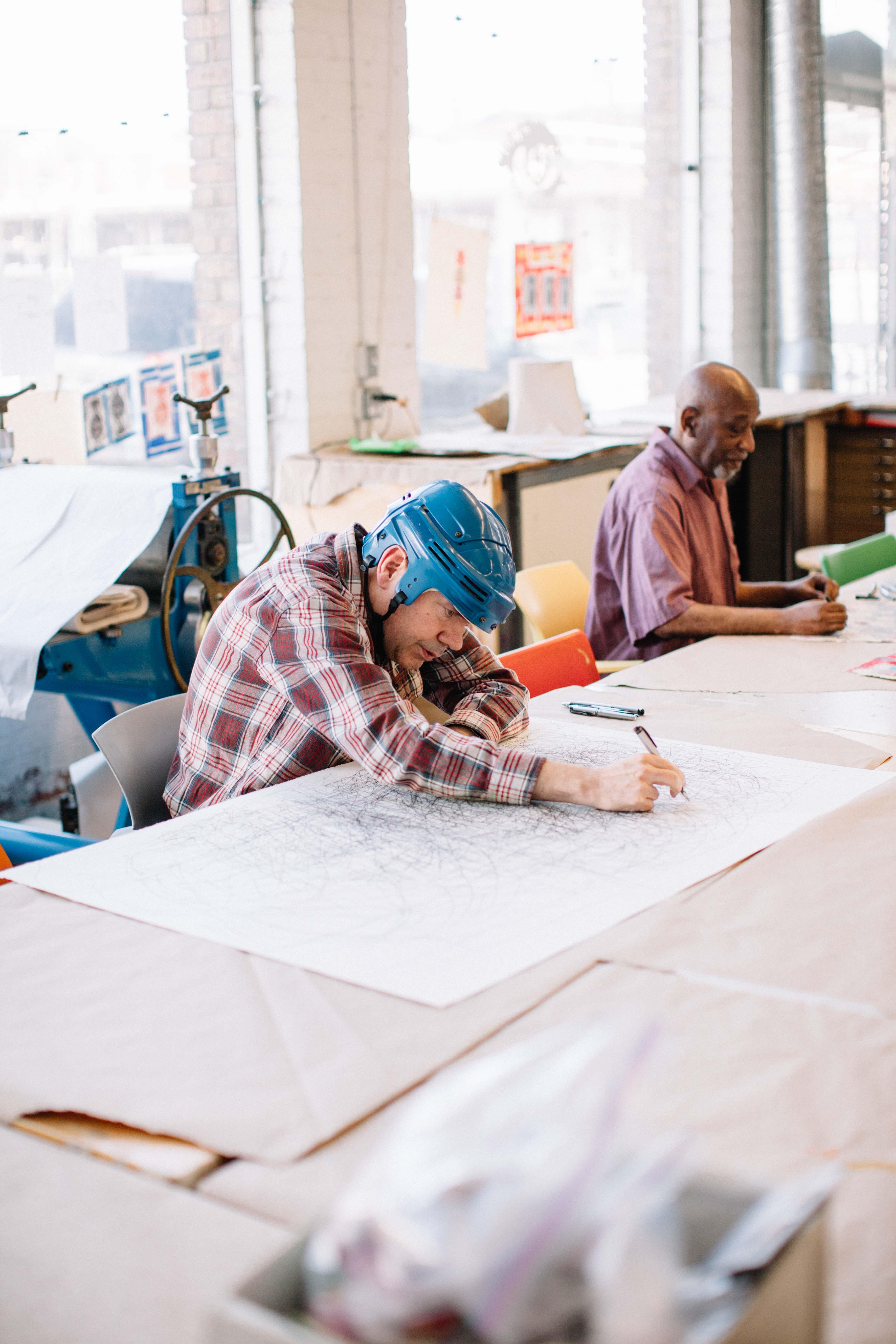 Artist Dan Miller joined Creative Growth almost 20 years ago, where he began cultivating his creative voice. Miller has limited verbal communication and prefers to use drawing to convey his thoughts. "Pull it gently." Miller repeats as he scrawls black pen over a large piece of paper. He looks at a woman sitting next to him, a one on one instructor, and asks "Right?". She smiles and nods her head, "Right." This process continues over the next 30 minutes, Miller repeating different words like "lightbulb" and "fan", occasionally checking in with the instructor, "Right?" "Right." As he speaks the words, he draws out the shape of a lightbulb. He writes the word "fan" over and over again, some letters overlapping, until the word is unrecognizable. The result is an image that your mind will work tirelessly to try and decipher. Some letters and symbols are familiar, others blend in with each other. The more the viewer looks, the more there is to see.