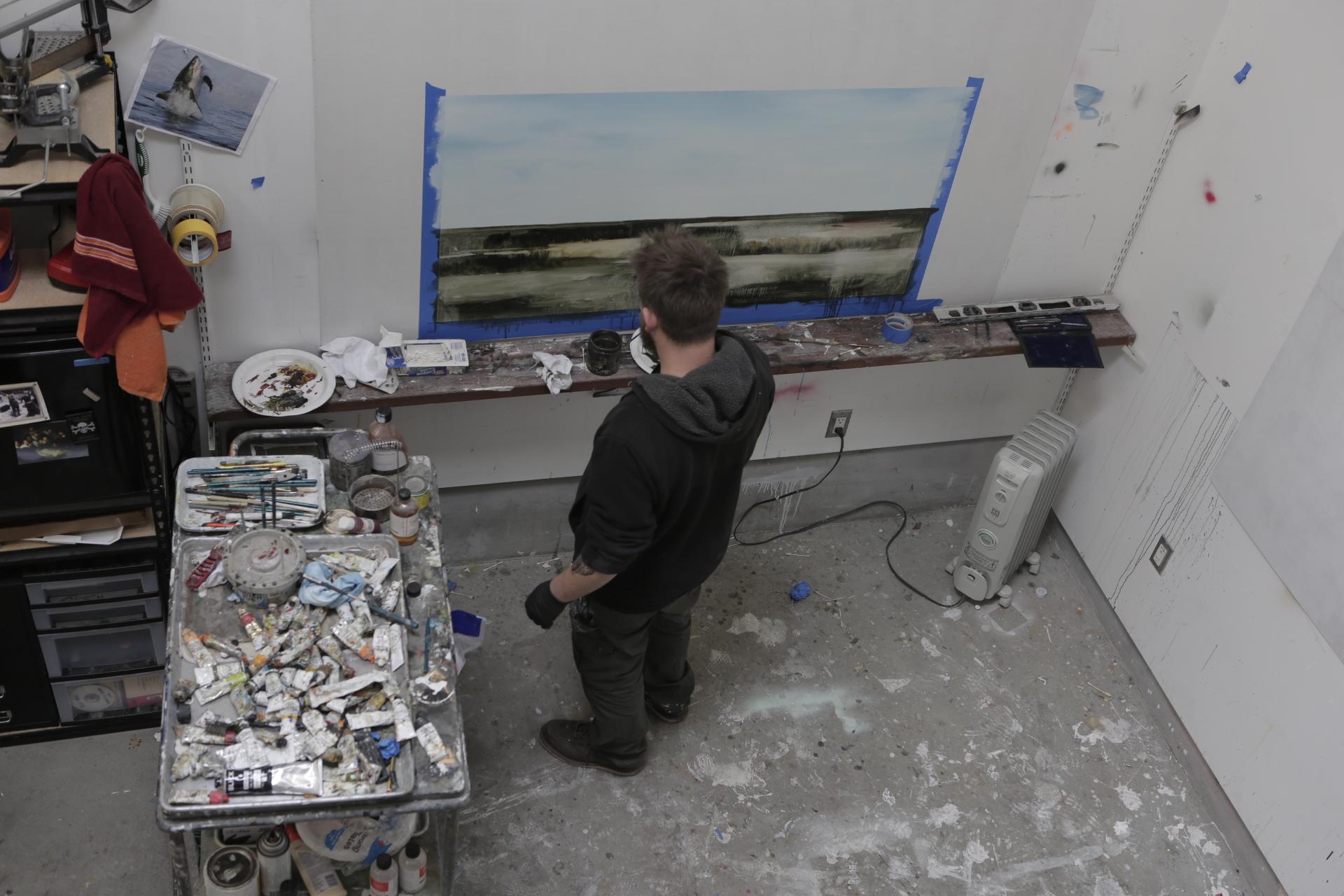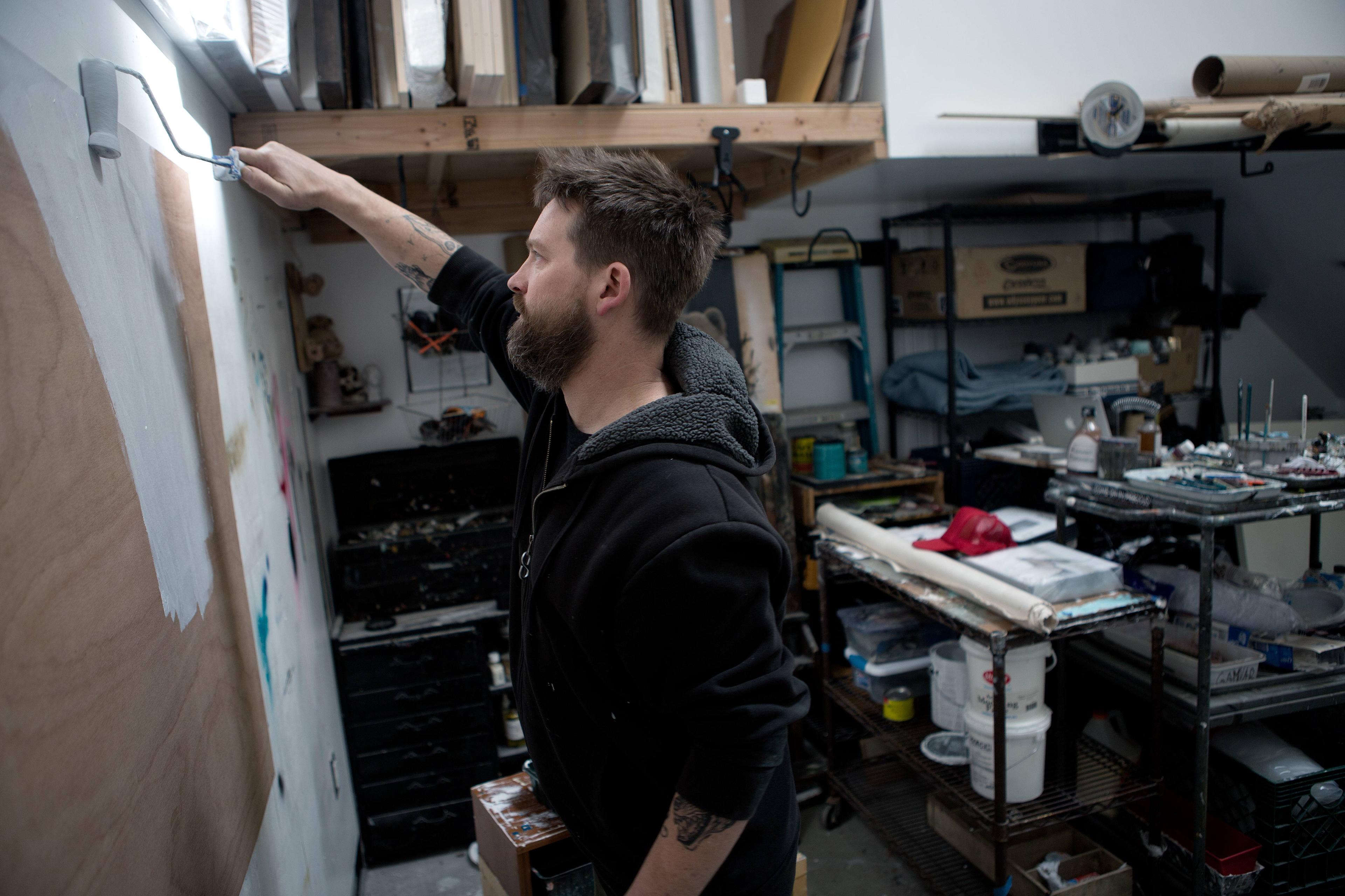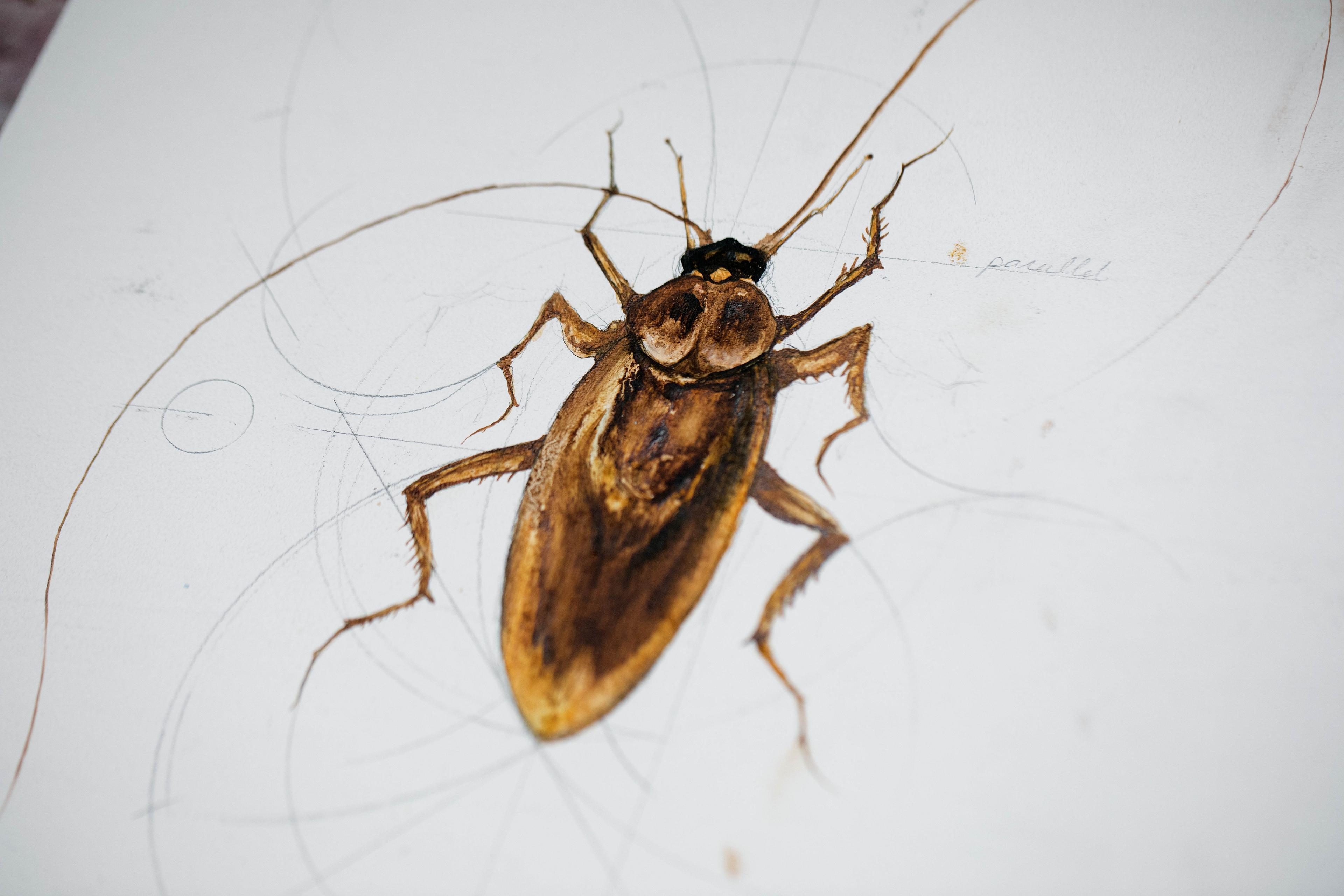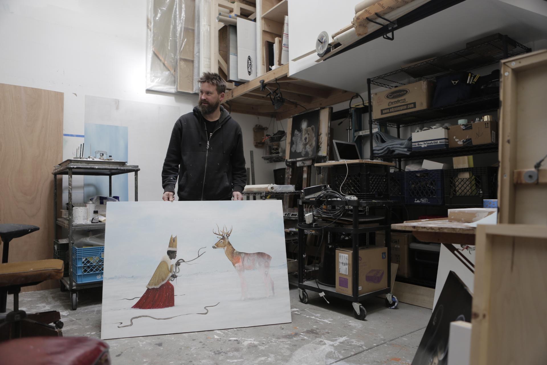 His paintings explore the relationships between the animal world and human world through imaginary and constructed narratives. Incongruous subjects—a cockroach framed by architectural lines, an antelope encountering a human heart—suggest a scientific language that lies beneath the one we know, but perhaps isn’t meant to be accessed. “We try way too hard to understand what is happening around us,” he says. “We’d probably be a little better off if we treated ourselves like animals.”