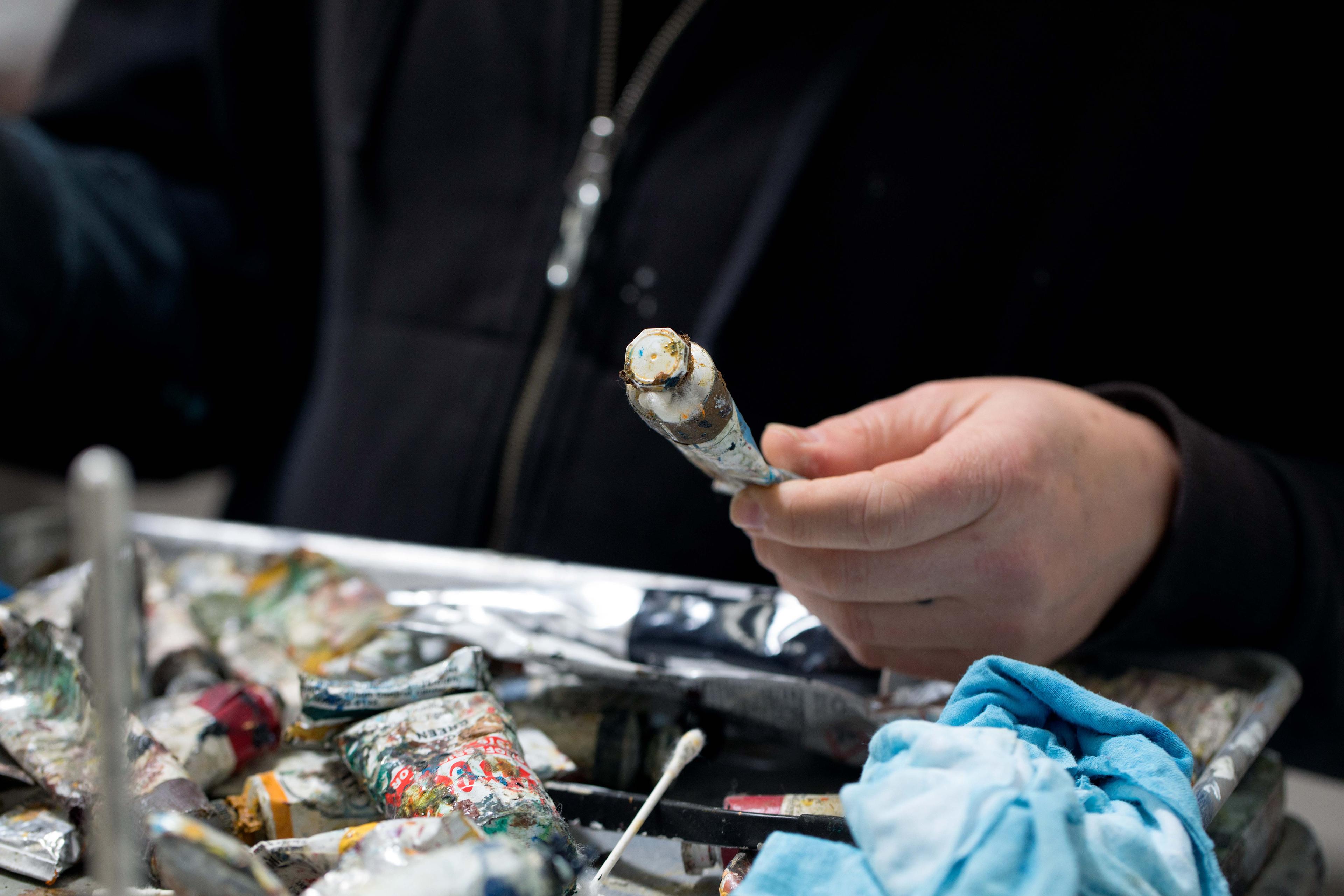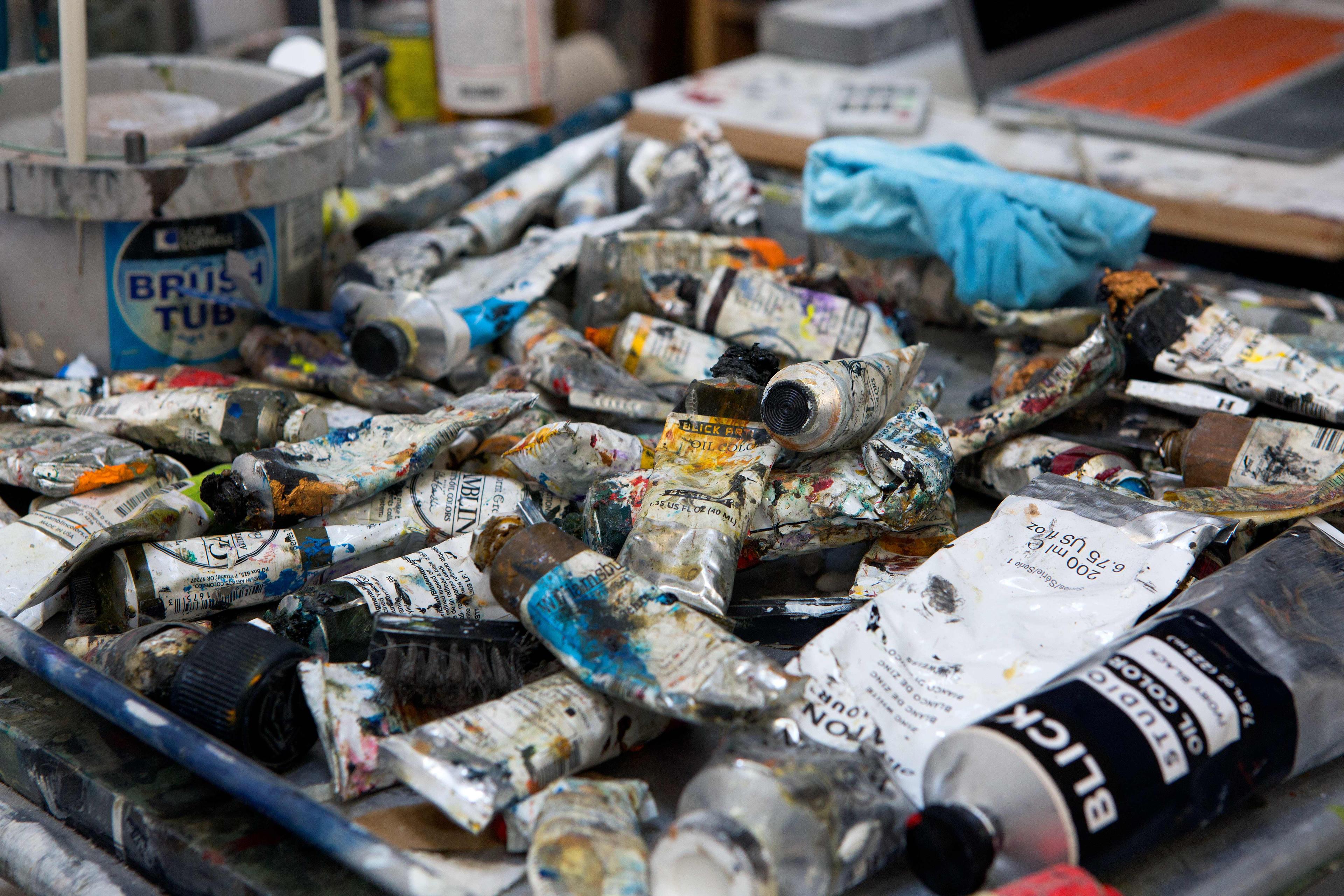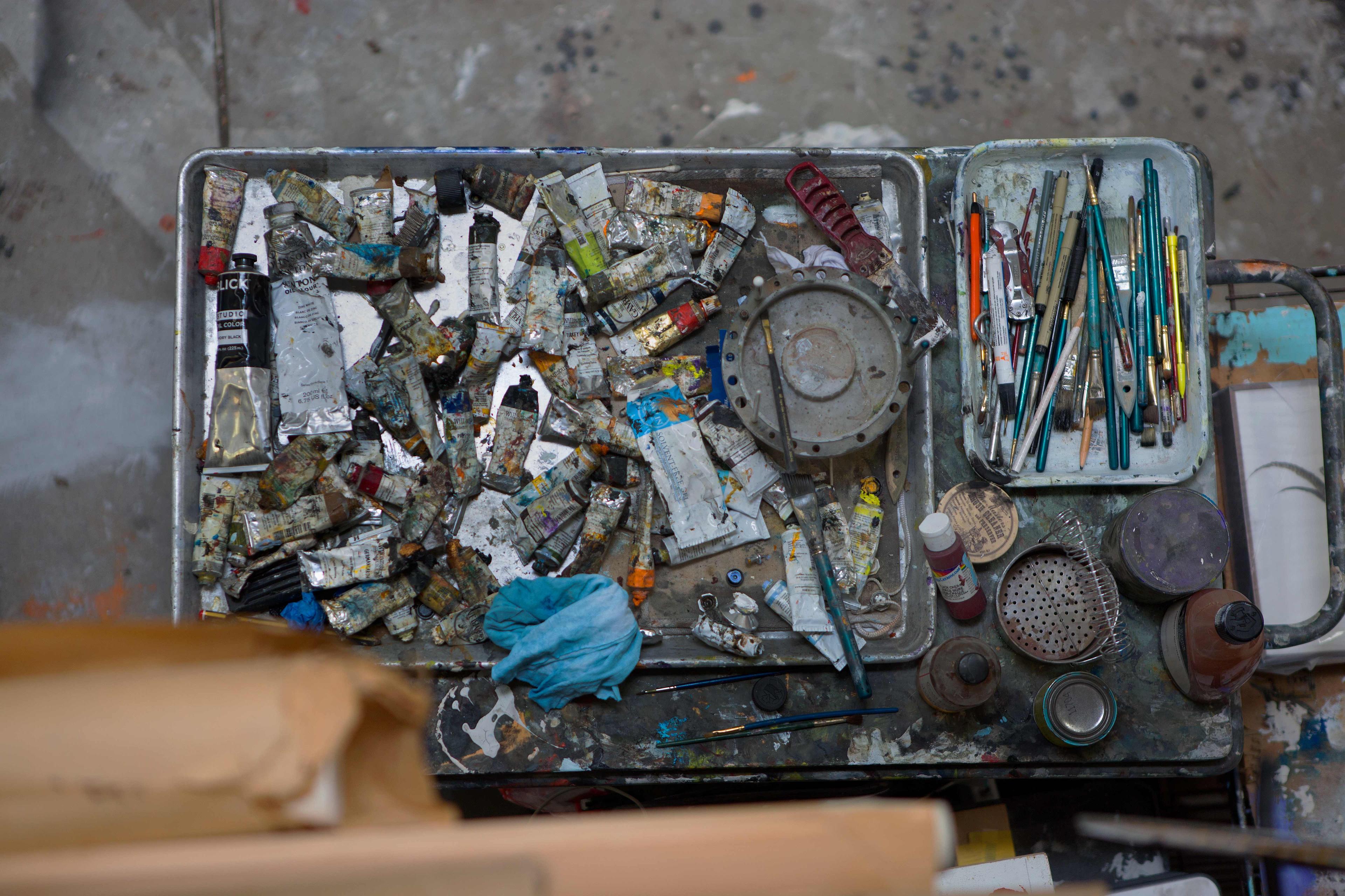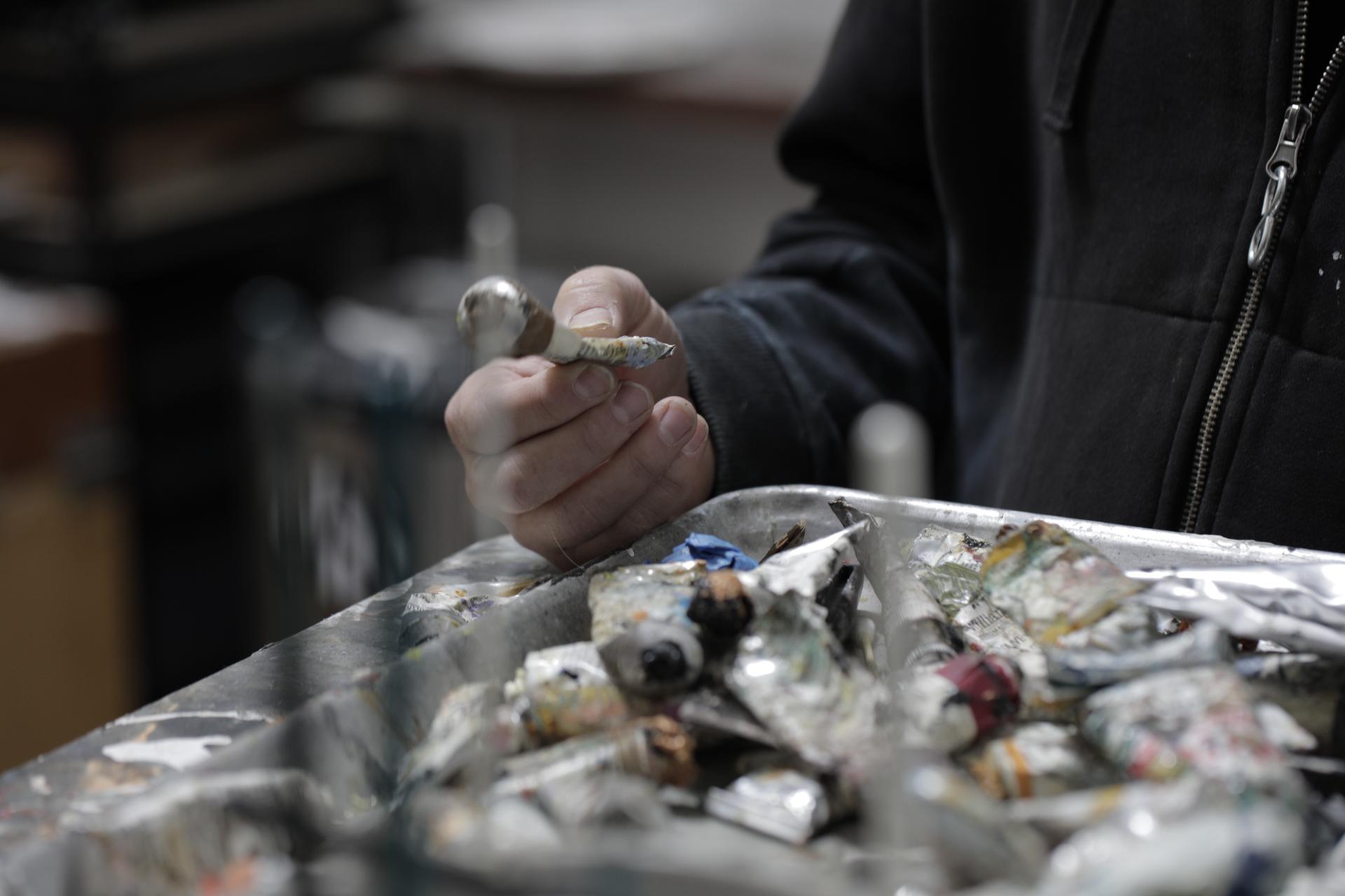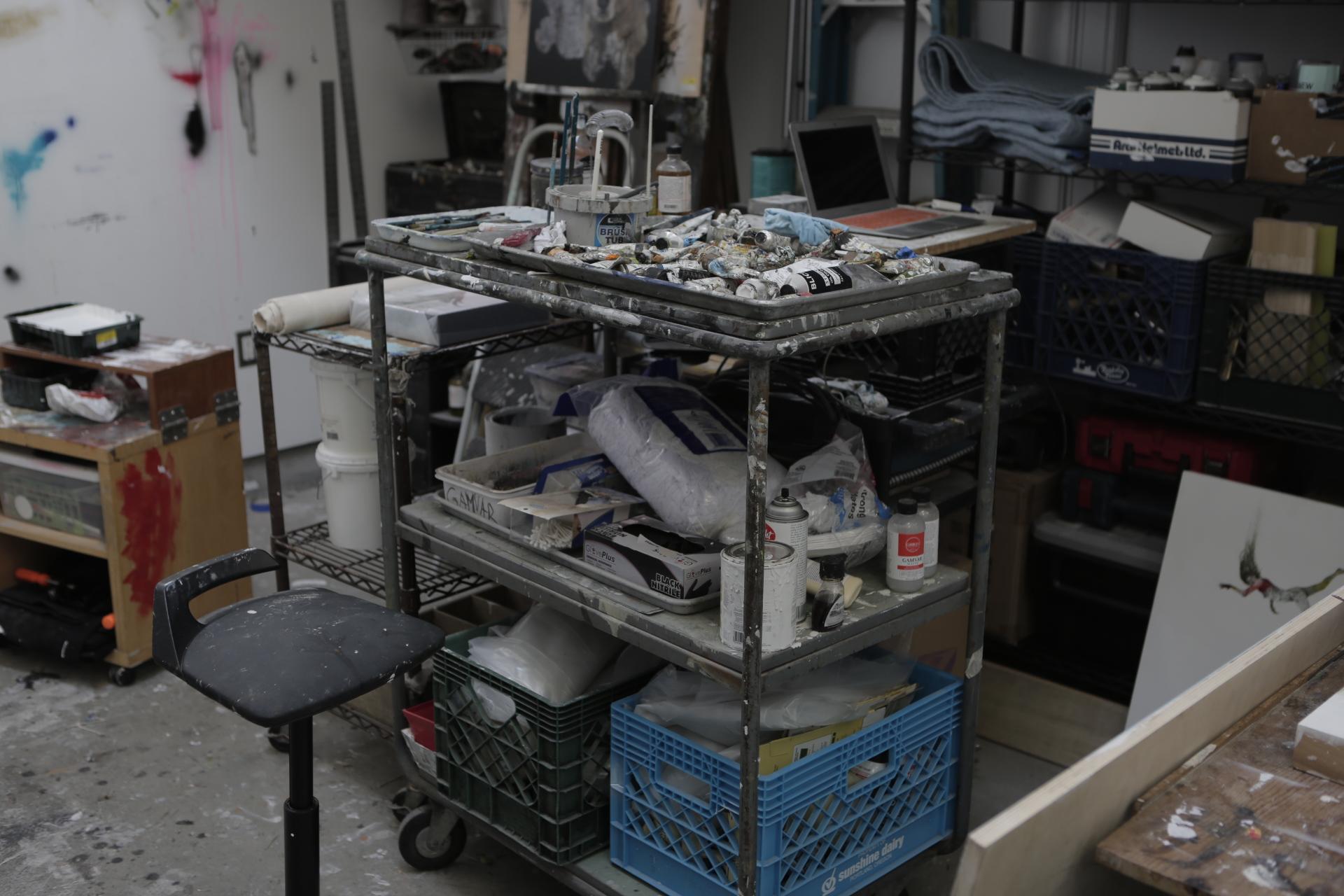 His paintings explore the relationships between the animal world and human world through imaginary and constructed narratives. Incongruous subjects—a cockroach framed by architectural lines, an antelope encountering a human heart—suggest a scientific language that lies beneath the one we know, but perhaps isn’t meant to be accessed. “We try way too hard to understand what is happening around us,” he says. “We’d probably be a little better off if we treated ourselves like animals.”