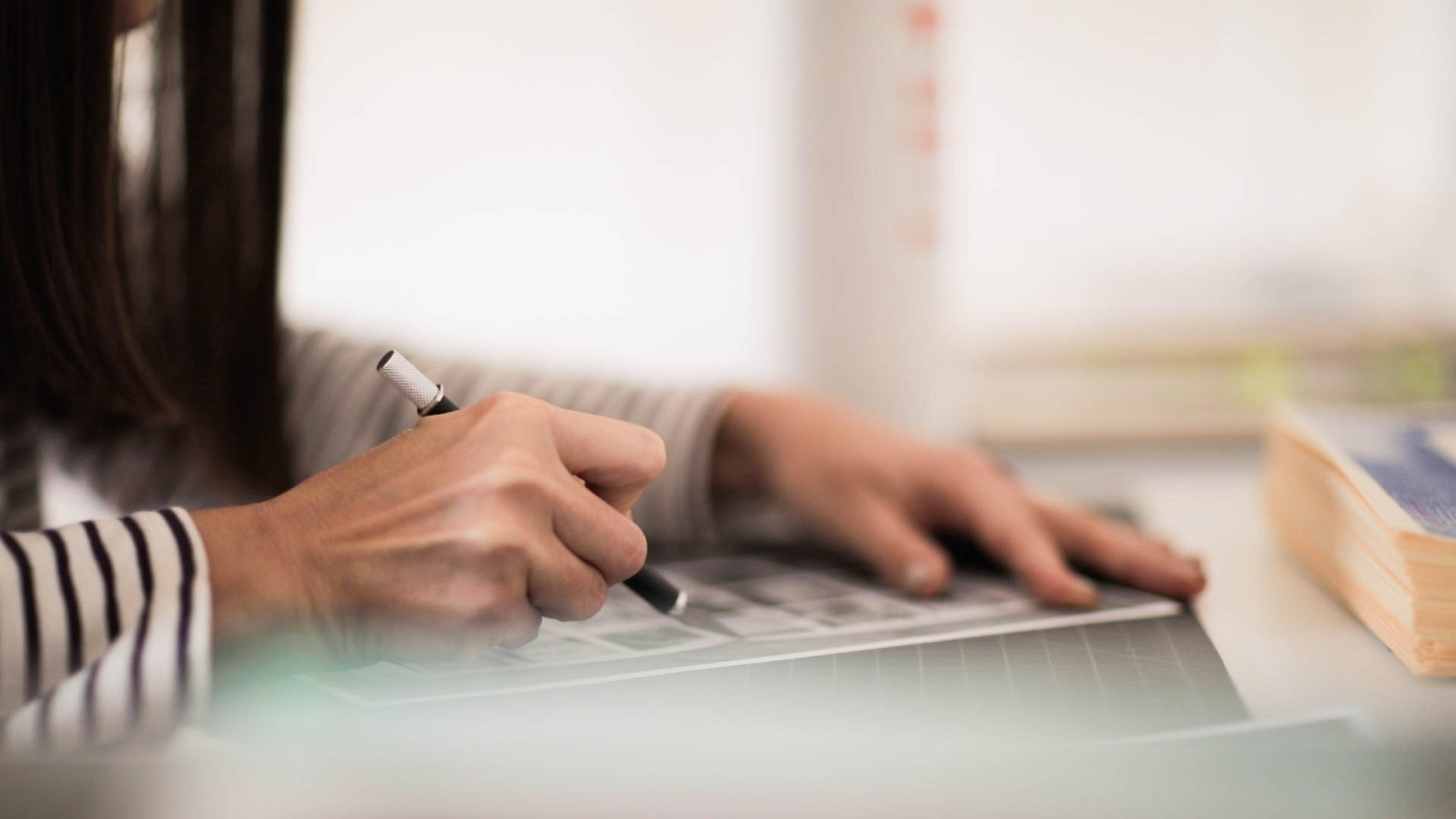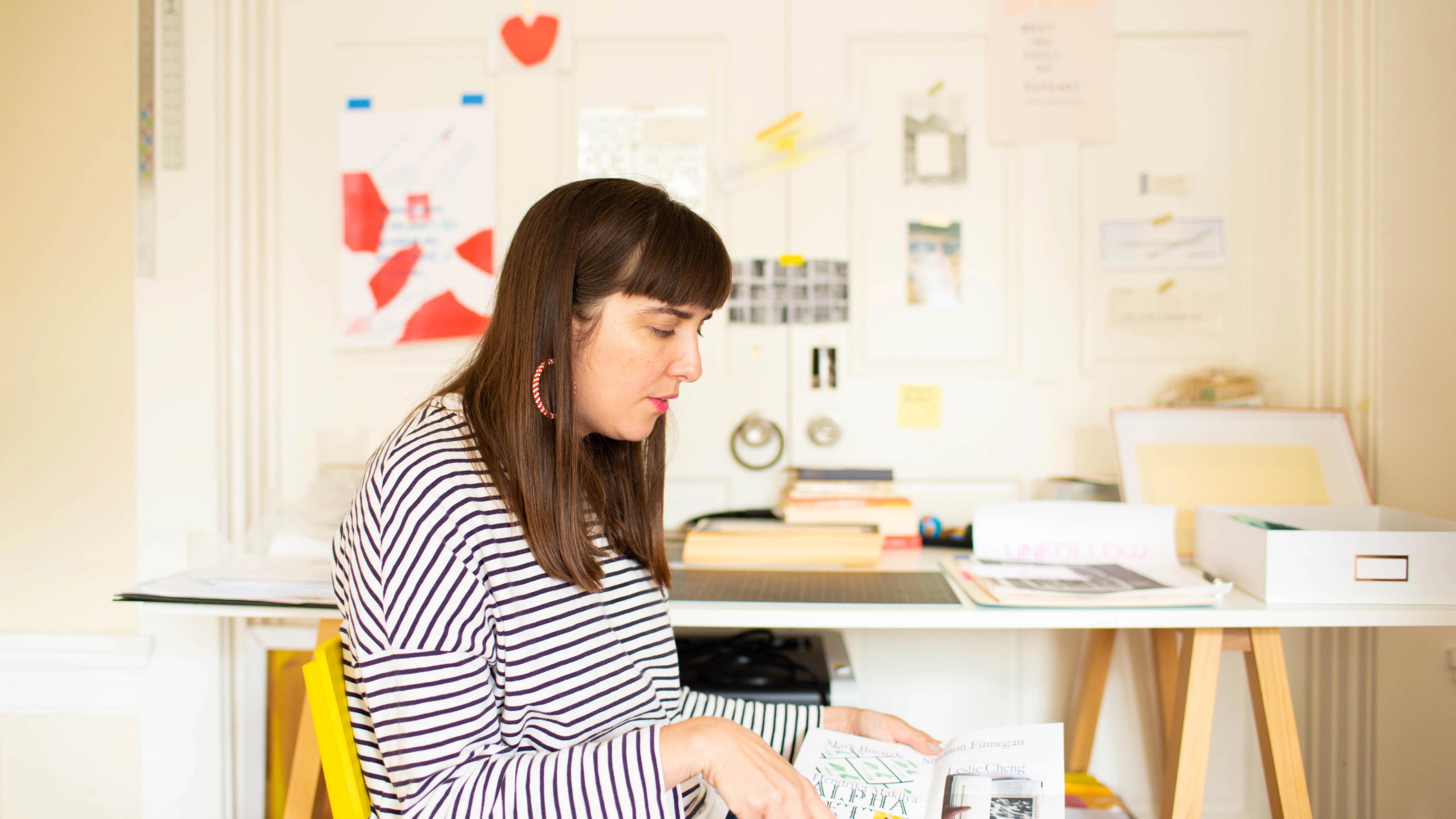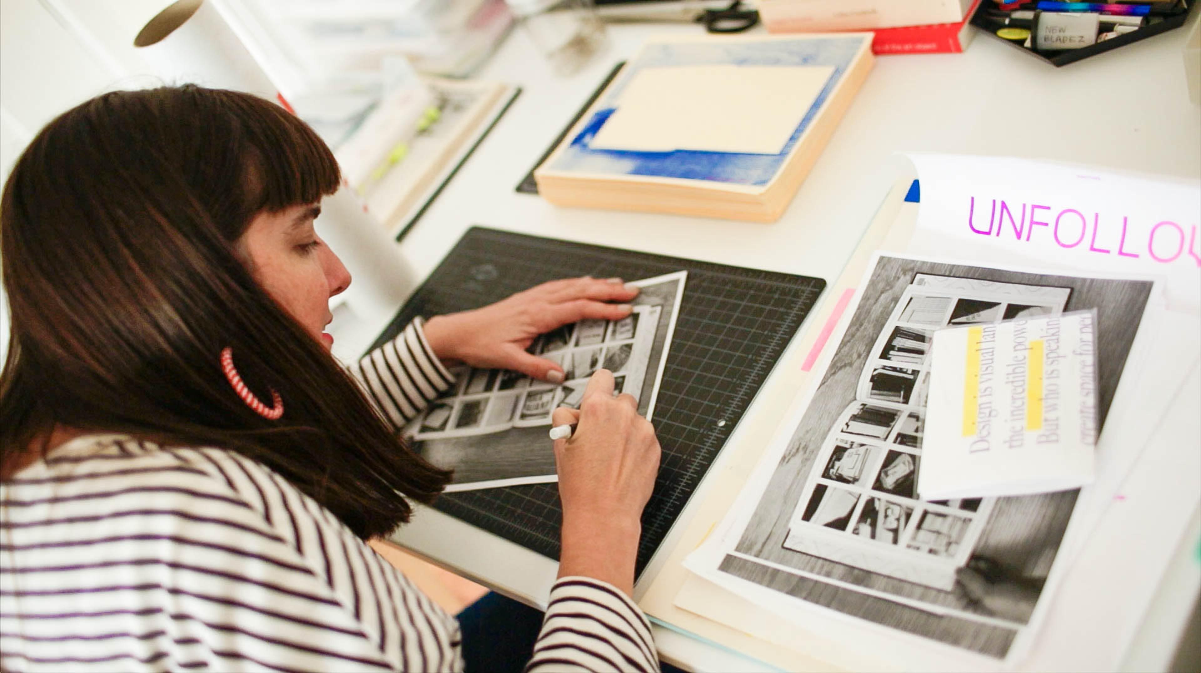 Mary Banas is surrounded by chromatic moments. Her desk is full of pops of color, a myriad of papers with glimpses of modern typography and several books by different authors, all well organized and eagerly awaiting to be referenced. Her walls bear carefully chosen images, cards, posters, and pictures propped up with colorful tape. Mary’s work of course is similar; deliberate and thoughtful with a pop of color.