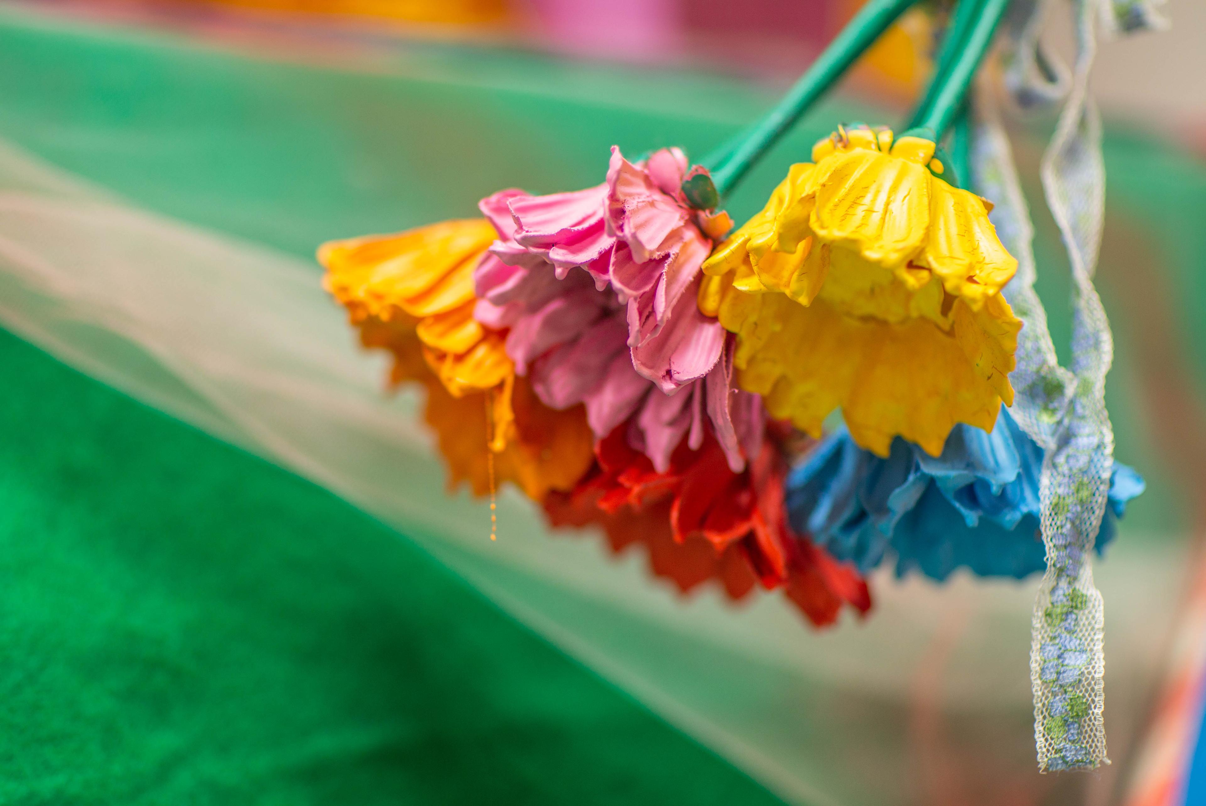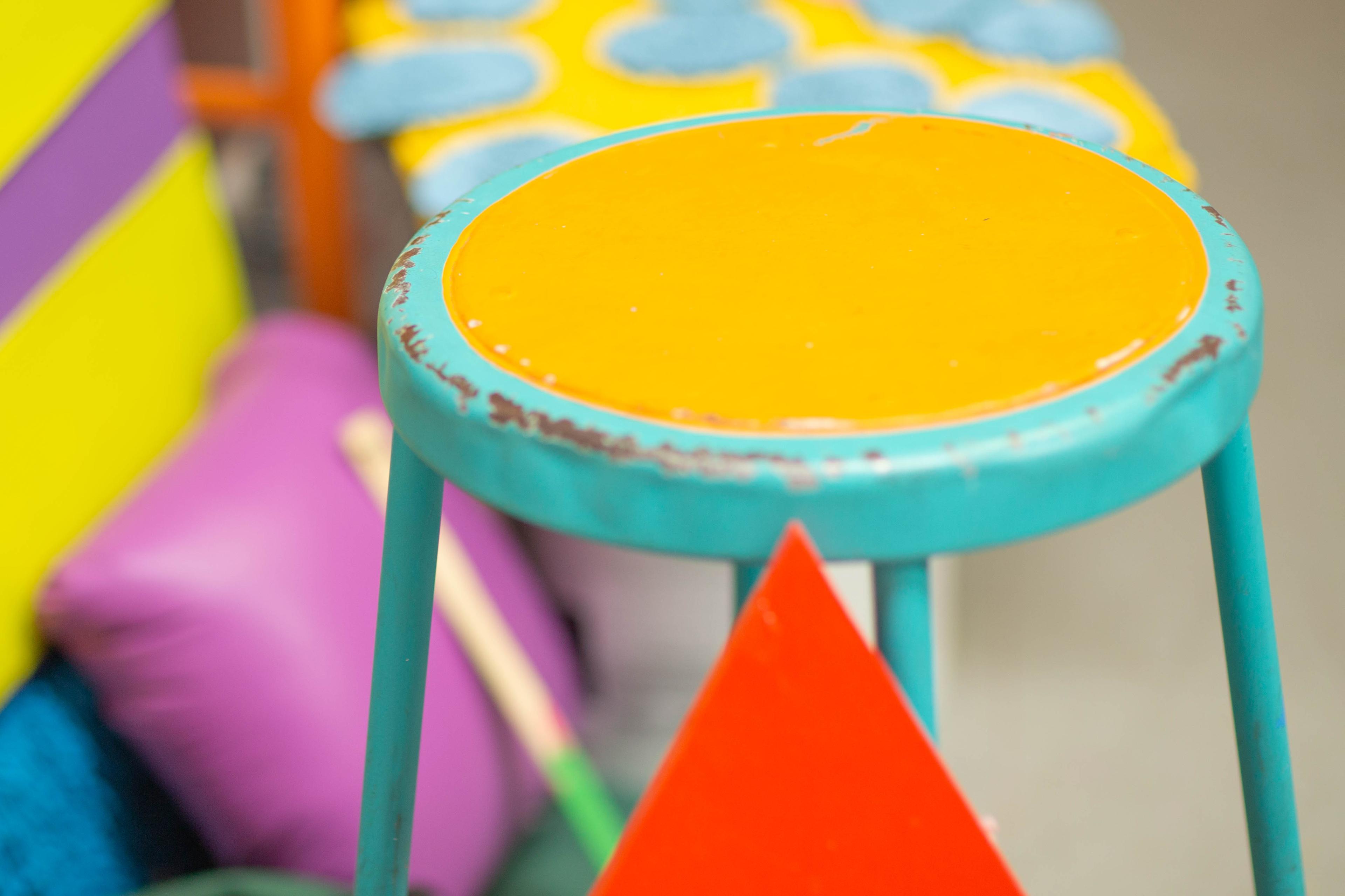 Observing an installation made by Sofie Ramos immediately transports you into a surreal world full of familiar furniture that is no longer functional, walls and objects camouflaged in brightly colored paint that defy gravity, and geometrical sculptures that appear two dimensional while occupying a three dimensional space. Pulling from a dynamic hoard of everyday found objects and materials masked in vibrant colors, she creates site-specific compositions that respond and adapt to, fuse with, and adulterate their surroundings. Upon viewing an installation by Ramos, one is immediately enticed to explore and investigate each aspect of the almost fantastical world she has created. Her work brings out your inner child, prompting you to come play. Full disclosure, you can look, but you can’t touch.